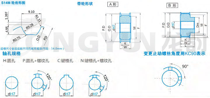 規格 形狀 節徑P.D 外徑O.D 擋邊外徑F 擋邊內徑M 輪轂直徑Dm 內孔dH7
