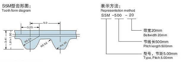 三個部分:指示帶的長度,間距和寬度帶回來的部分號碼。如下圖所示。此S5M橡膠單麵齒同步帶型號,節線長為500mm,帶寬為20mm。